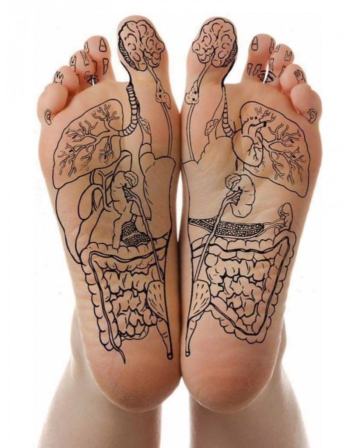 - Reflexzones: de voetzool is verdeeld in zones die overeenkomen met organen, spieren en weefsels.
